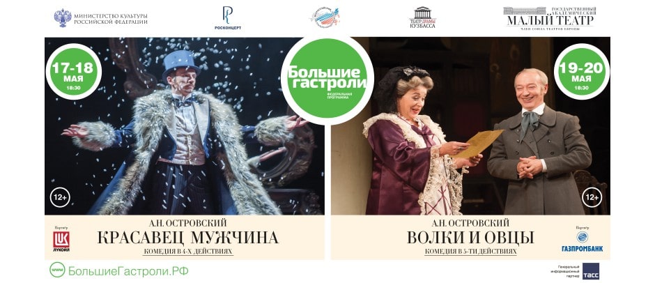 С 17 по 26 мая в рамках реализации Федеральной программы «Большие гастроли» Государственный Академический Малый театр покажет комедии по пьесам А.Н. Островского на сценах Театра драмы Кузбасса им. А.В. Луначарского и Новокузнецкого драматического театра.На сцене Театра драмы Кузбасса им. А.В. Луначарского пройдут спектакли: 17 и 18 мая в 18:30 состоятся показы комедии «Красавец мужчина». 19 и 20 мая в 18:30 Государственный Академический Малый театр представит комедию «Волки и Овцы».