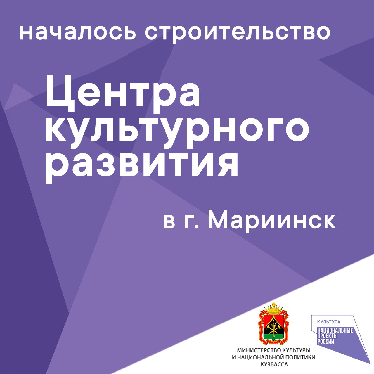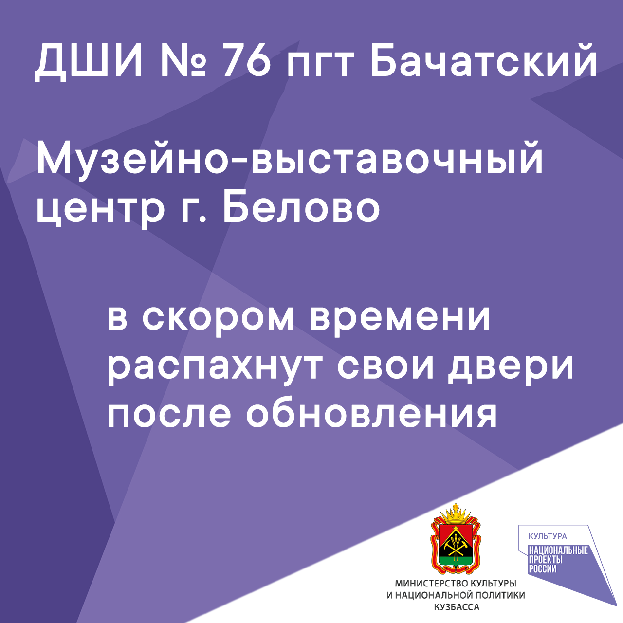 Так, в ближайшее время в Белове состоится открытие сразу четырех объектов - Музейно-выставочного центра, детской школы искусств №76 в поселке Бачатский, оборудованного кинозала в поселке Грамотеино, а также построенного Дома культуры в селе Заречное (место компактного проживания телеутов), в нем предусмотрены студии национальных ремесел и изучения телеутского языка, которые будут способствовать сохранению национальной культуры народности. В Мариинске по нацпроекту началось строительство Центра культурного развития.