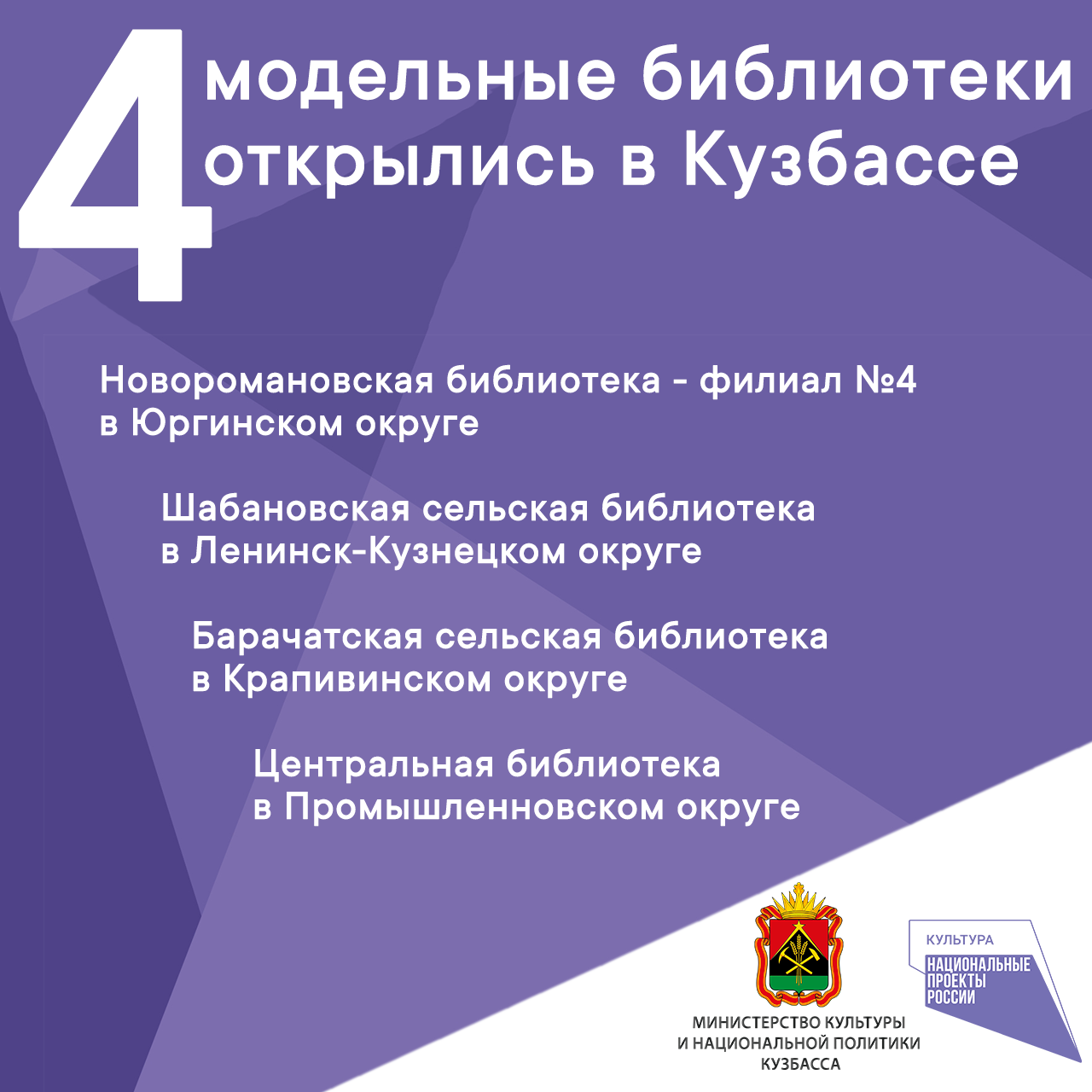 В 2022 году в регионе открылись четыре модельные библиотеки: Новоромановская библиотека – филиал №4 в Юргинском округе, Шабановская сельская библиотека в Ленинск-Кузнецком округе, Барачатская сельская библиотека в Крапивинском округе и Центральная библиотека в Промышленновском округе. Теперь это не просто места, куда приходят за книгами, а многофункциональные просветительско-информационные центры, где обучают компьютерной грамоте пожилых жителей округа, устраивают тематические вечера для молодежи и детей, проводят мастер-классы в творческих студиях.