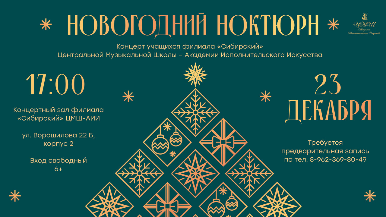 23 декабря в 17:00 в Концертном зале филиала «Сибирский» Центральной музыкальной школы – Академии исполнительского искусства состоится большой концерт учащихся Филиала. На сцену выйдут представители всех отделений. Яркий творческий вечер будет наполнен классическими произведениями российских и зарубежных композиторов. Вдохновенные выступления артистов окунут зрителей в атмосферу волшебства в канун самого долгожданного праздника Нового года.