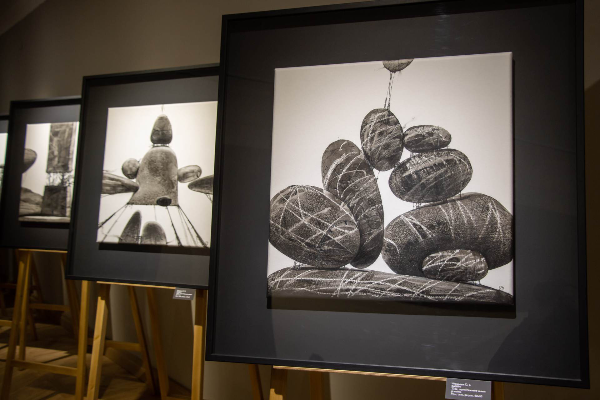 Картины выполнены в различных графических техниках. Они построены на контрасте густого фактурного серого, черного, стерильно белого цветов и демонстрируют самобытный стиль мастеров.