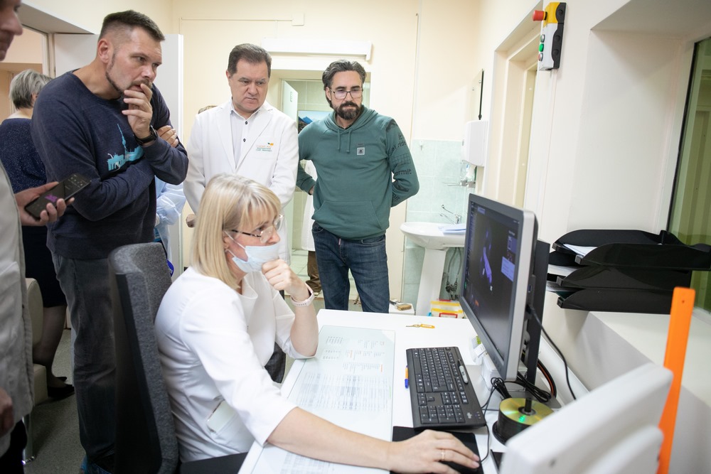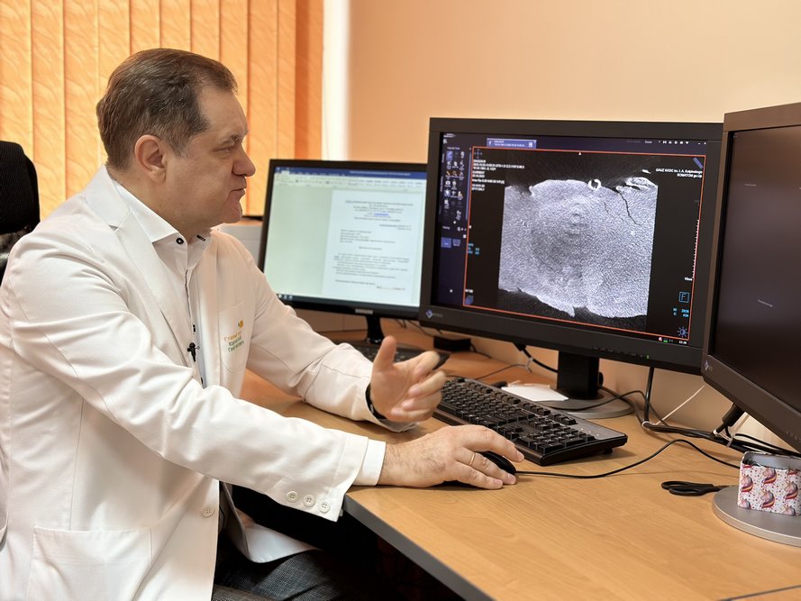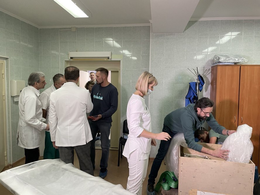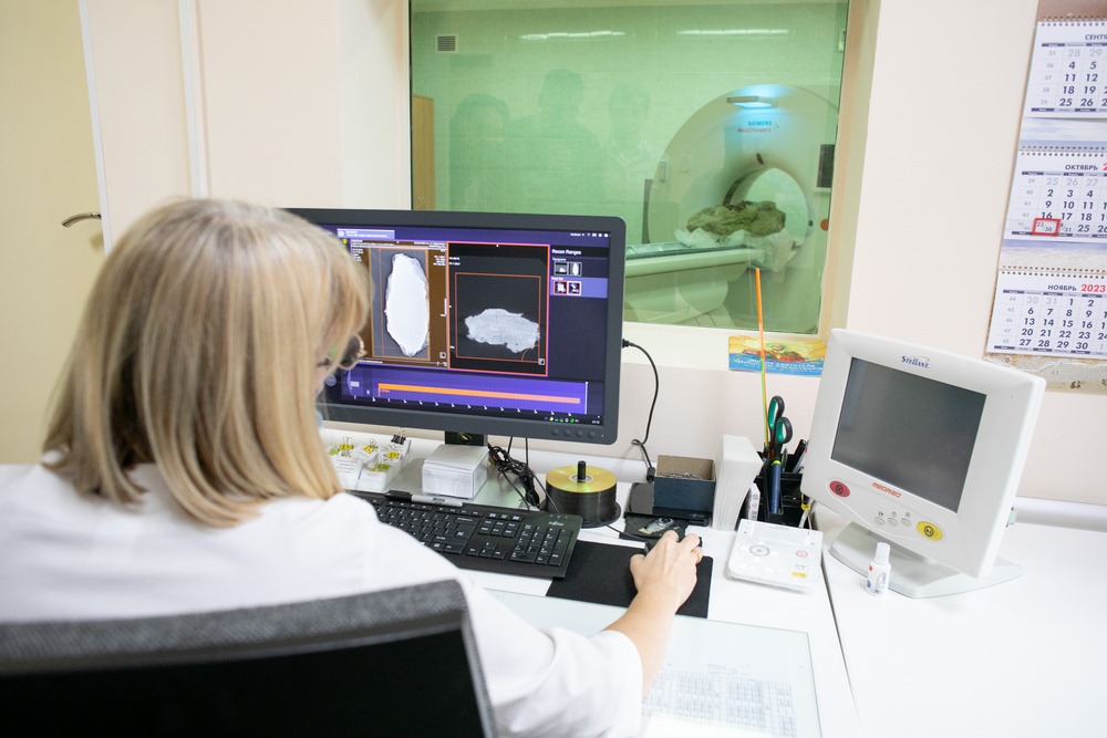 Сегодня на томографическое исследование в Клинический консультативно-диагностический центр привезли 139-килограммовый монолит песчаника, содержащего фрагменты скелета динозавра. Аппарат МСКТ позволил сформировать трехмерные модели исследуемых объектов и изучать изображение с разных ракурсов.