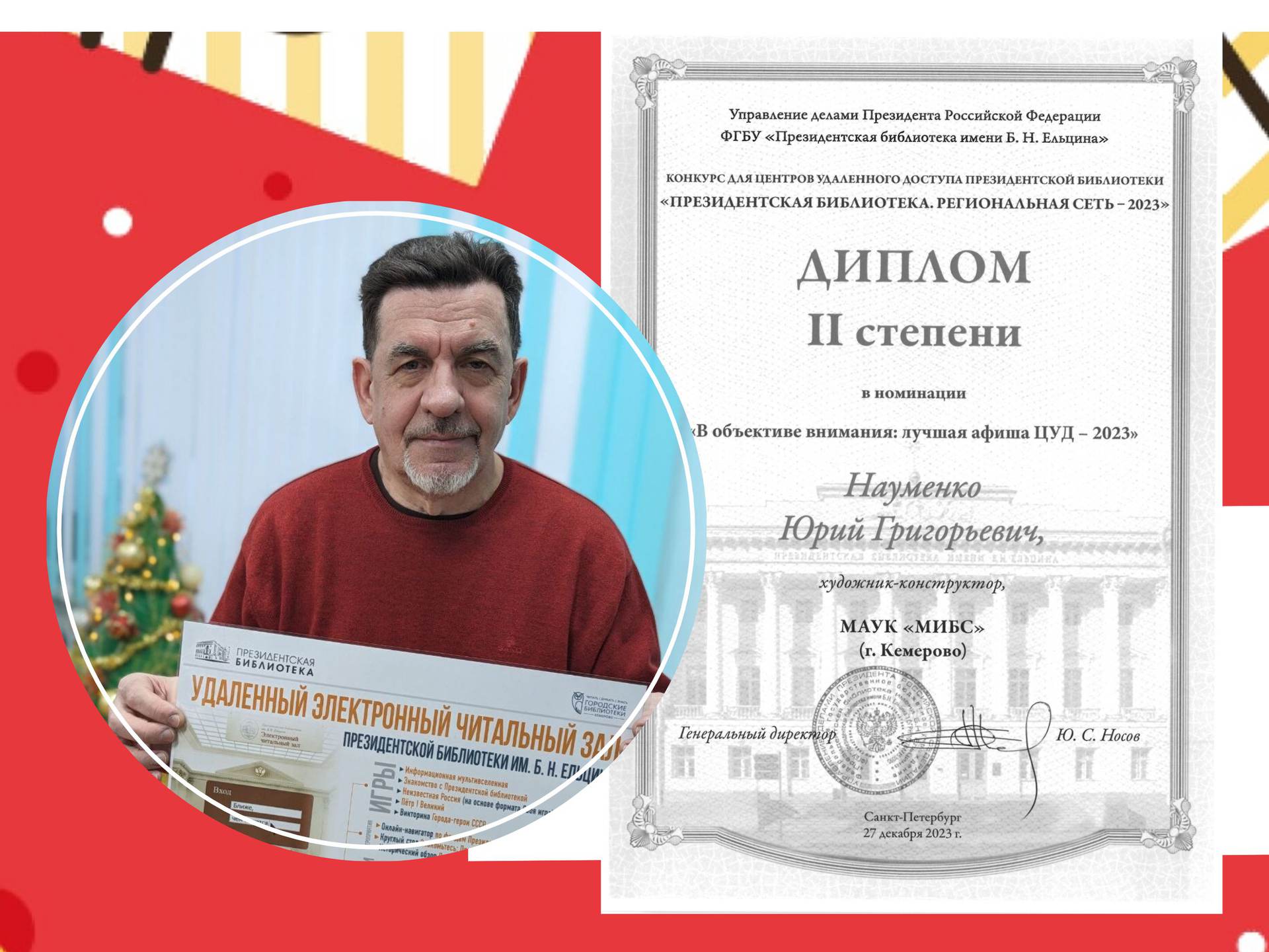 Диплом II степени в номинации «В объективе внимания: лучшая афиша ЦУД-2023» - Юрий Науменко, художник-конструктор Муниципальной информационно-библиотечной системы г. Кемерово.