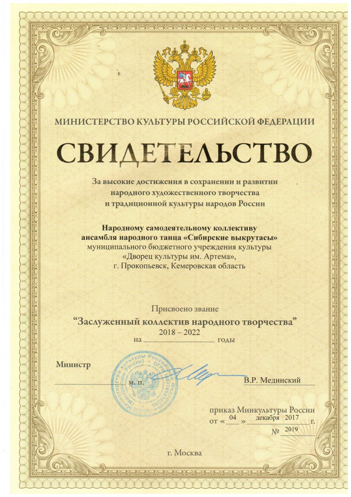 16 января 2018г. в Управлении по культуре Администрации города Прокопьевска состоялось расширенное совещание директоров учреждений культуры города, на котором было вручено свидетельство о присвоении звания «Заслуженный коллектив народного творчества» народному самодеятельному коллективу, ансамблю народного танца «Сибирские выкрутасы» МБУК «Дворец культуры им. Артема», художественный руководитель – заслуженный работник культуры РФ, лауреат премии правительства РФ «Душа России» Геннадий Анатольевич Верняковский.Прокопьевский коллектив был награжден Министерством культуры РФ за высокие достижения в сохранении и развитии народного художественного творчества и традиционной культуры России сроком на пять лет. В Кемеровской области такое высокое звание имеют еще три самодеятельных коллектива. «Сибирские выкрутасы» стали первыми в своем городе.