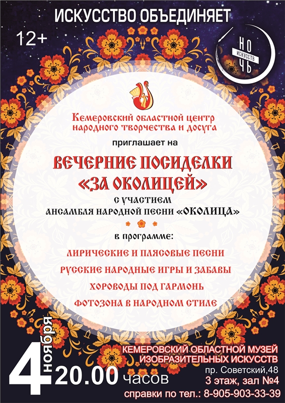 04 ноября 2018 г. в 20.00 часов в рамках акции «Ночь искусств» Кемеровским областным центром народного творчества и досуга запланировано творческое мероприятие «Вечерние посиделки за Околицей». Мероприятие пройдет в стенах Кемеровского областного музея изобразительных искусств.Программа посиделок обещает быть разнообразной и интересной. Яркую атмосферу русского народного колорита создаст ансамбль народной песни «Околица». Участники ансамбля исполнят плясовые и лирические песни, предложат гостям музея русские народные игры и забавы, хороводы под гармонь. В специальной фотозоне, стилизованной под русскую избу, каждый желающий сможет примерить на себя новый образ при помощи тантамарески.