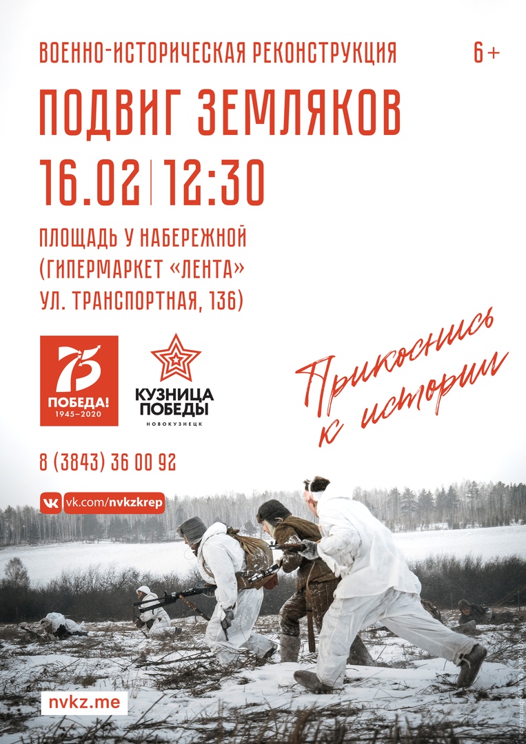 16 февраля в 12.30 в Новокузнецке пройдёт военно-историческая реконструкция подвига красноармейцев Леонтия Черемнова, Ивана Герасименко и Александра Красилова. Мероприятие посвящено 75-летию Победы в Великой Отечественной войне 1941-1945 годов.