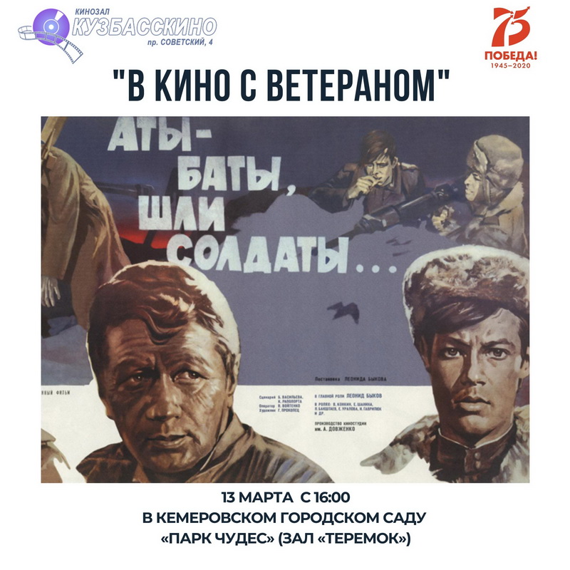 Акция «В кино с ветераном» продолжается. 13 марта в формате инсталляции военно-полевого кинозала в Кемеровском «Парке Чудес» (зал «Теремок») воспитанники школы-интерната №22 и ветераны Заводского района Кемерова посмотрят фильм «Аты-баты шли солдаты». Участники Великой Отечественной войны после просмотра кинохроники расскажут школьникам свои истории.