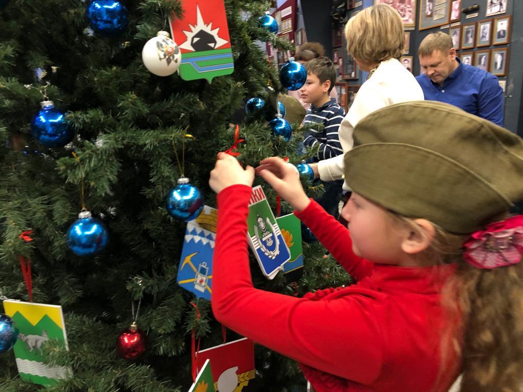 Дети украсили праздничное дерево гербами городов Кемеровской области, а также уникальными геральдическими шарами, которые отражают историю российской государственной символики.