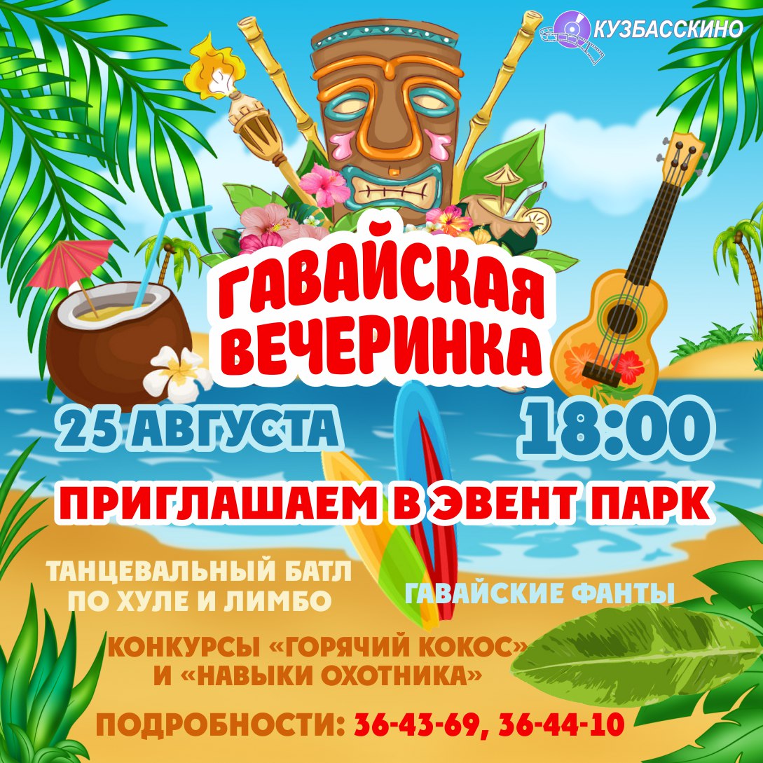 25 августа в 18:00 в летнем креативно-рекреационном пространстве Эвент парк Кузбасскино пройдет шоу программа «Гавайская вечеринка».