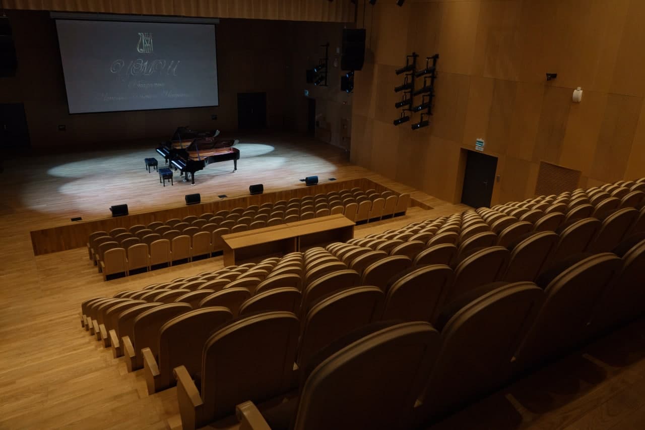 Концертный зал школы рассчитан на 280 мест. Он выполнен в бежево-коричневых тонах и цветах натурального дерева. Интерьер создает атмосферу уюта и располагает к приятному общению с классическим музыкальным искусством. Для создания качественной акустики стены оформлены специальными панелями, пол покрыт паркетом из натурального дуба.