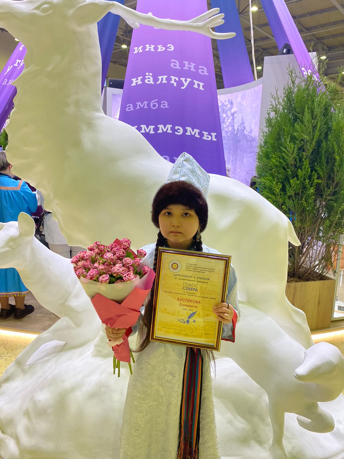Ученица 4-го класса, воспитанница Дома детского творчества объединения «К истокам телеутской культуры» (г. Белово) Елизавета Куспекова стала дипломантом 1-й степени IV Всероссийского очного конкурса детского литературного творчества на родном языке «Голос Севера» в Санкт-Петербурге. Девочка представила на конкурс три своих произведения, написанных на родном телеутском языке: притчи «Белая скатерть», «Двоечник Петя» и сказку «Доброе сердце».Всероссийский конкурс детского литературного творчества на родном языке «Голос Севера» проходил в четырех номинациях: «Проза на родном языке», «Поэзия на родном языке», «Детское литературное творчество на родном языке (до 15 лет)», «Герои наших дней — защитники Родины, народа, своего рода».