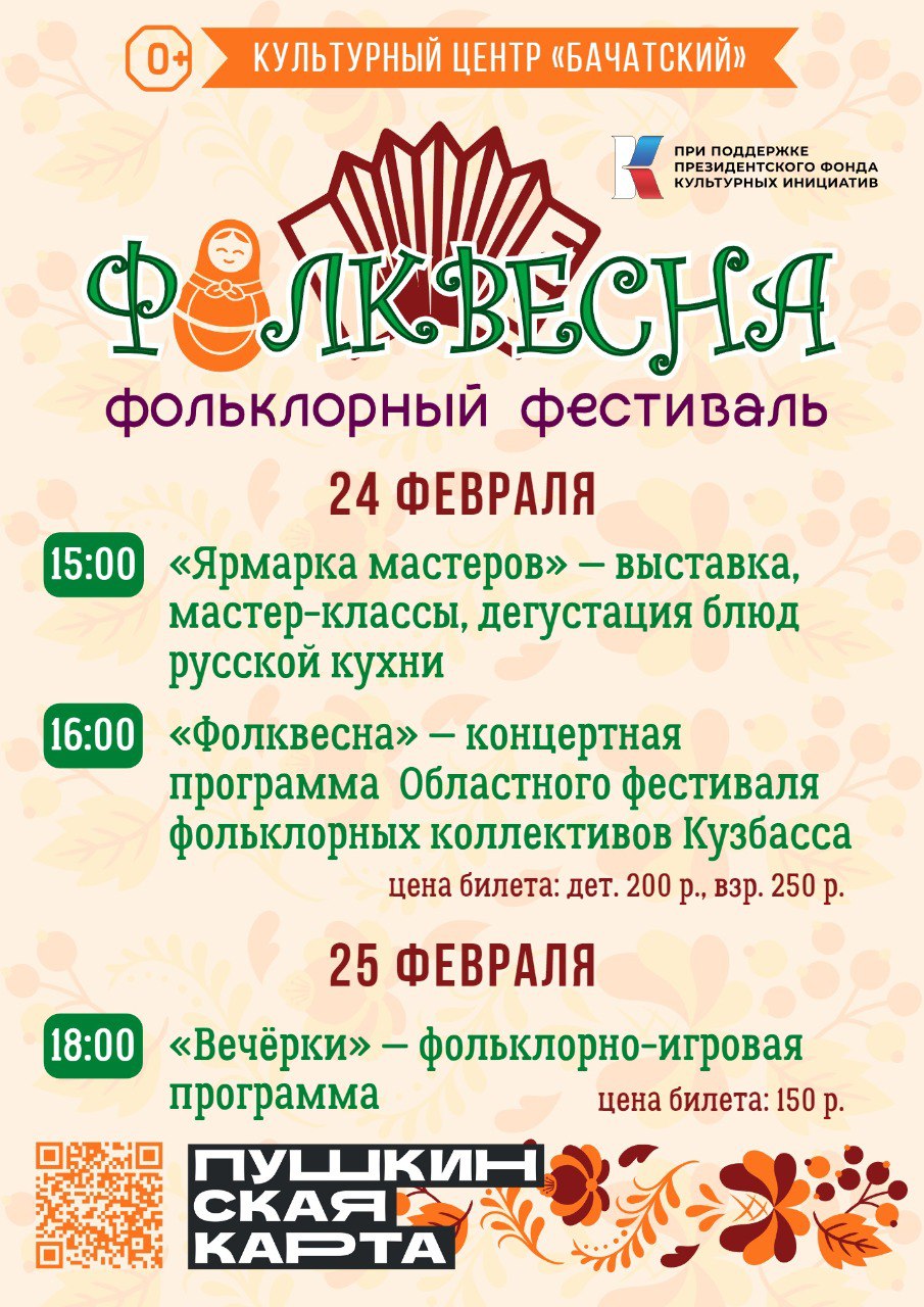 В 2022 году Бачатский проект «ФолкВесна» стал победителем грантового конкурса Президентского фонда культурных инициатив. В первый день фестиваля на большой сцене пройдет концертная программа. Коллективы региона выступят по разным направлениям: «Сказители», «Фольклорно-этнографическое исполнение», «Сценический фольклор», «Игра на русских народных музыкальных инструментах».