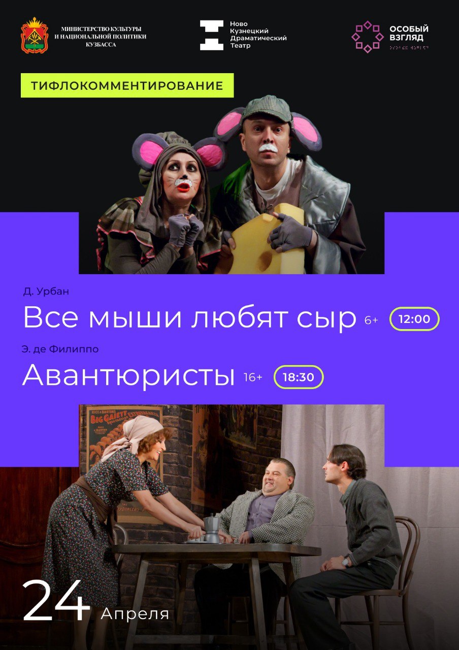 24 апреля и 2 мая на сцене Новокузнецкого драматического театра пройдут четырех спектаклей с использованием технологии тифлокомментирования для описания обстановки, пространства и действий персонажей. Через персональные наушники зрители получат информацию о том, что будет происходить на сцене. Благодаря этому у слабовидящих будет возможность понять ход пьесы.24 мая будет показан спектакль «Все мыши любят сыр» (в 12:00) и «Авантюристы» (в 18:30).