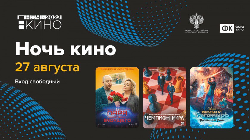 Кроме того, в этот день пройдет Всероссийская акция «Ночь кино-2022» – традиционное ежегодное кинособытие, которое проходит при поддержке Федерального фонда социальной и экономической поддержки отечественной кинематографии совместно с Минкультуры России. На 80-ти площадках Кузбасса пройдут показы фильмов. Зрители увидят три самые значимые российские картины 2020 и 2021 годов - «Чемпион мира» (режиссер Алексей Сидоров), «Пара из будущего» (режиссер: Алексей Нужный), «Последний богатырь: посланник тьмы» (режиссер: Дмитрий Дьяченко). В городе Кемерово показы начнутся в 20:00 в летнем кинотеатре ГАУК «Кузбасскино» по адресу пр. Советский, 4. Вход свободный.