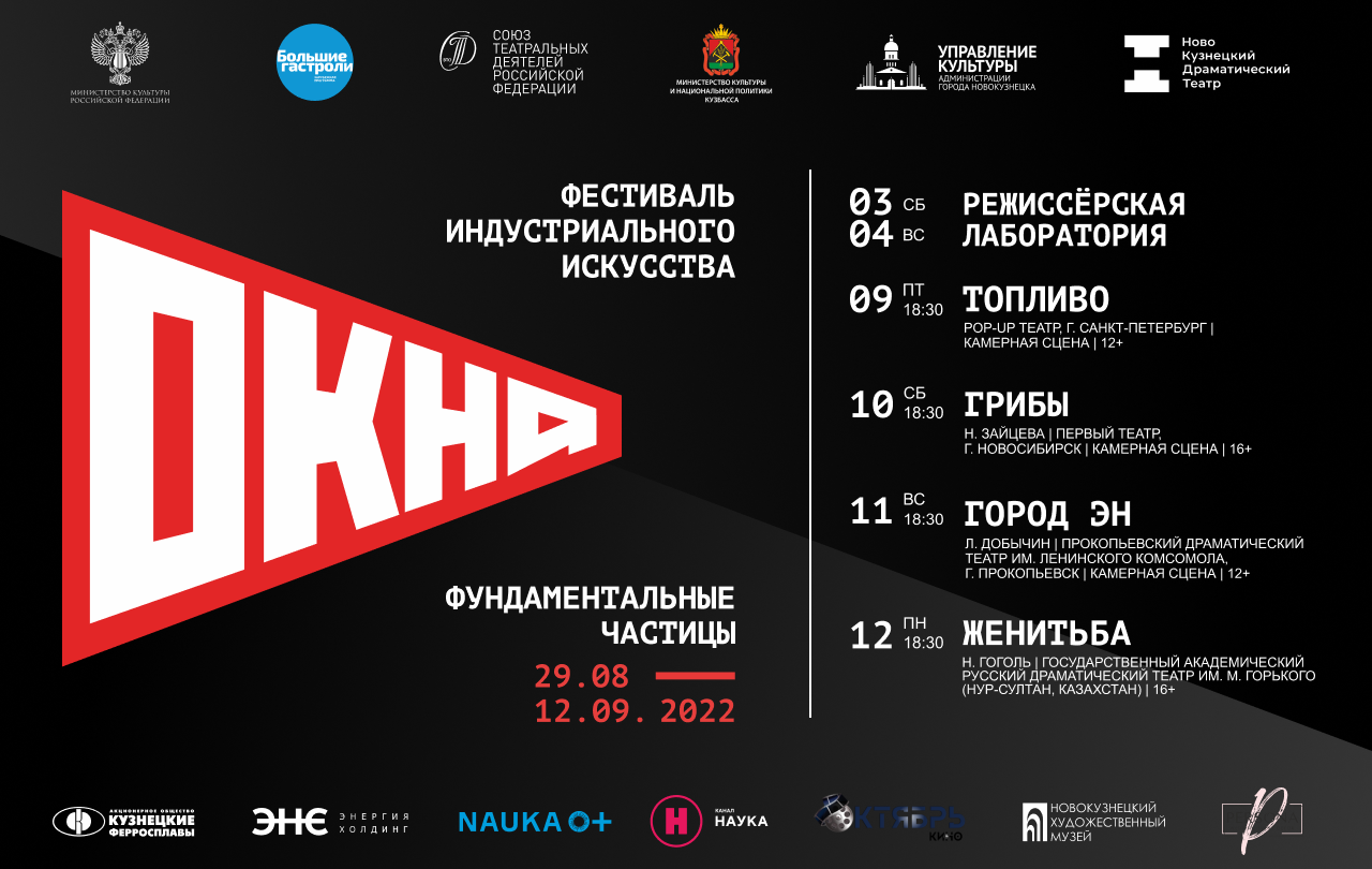 9 сентября Международный фестиваль индустриального искусства «ОКНА» откроет новый 90-й театральный сезон Новокузнецкого драматического театра. Проект пройдет при поддержке Министерства культуры Российской Федерации, Союза театральных деятелей РФ, Министерства культуры и национальной политики Кузбасса, Управления культуры администрации города Новокузнецка, Всероссийского фестиваля «Nauka 0+». Партнеры проекта: АО «Кузнецкие ферросплавы», ООО «Энергия холдинг», Телеканал «Наука», Кинотеатр «Октябрь», Новокузнецкий художественный музей, студия авторского декора «Персона-Престиж».