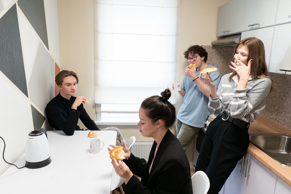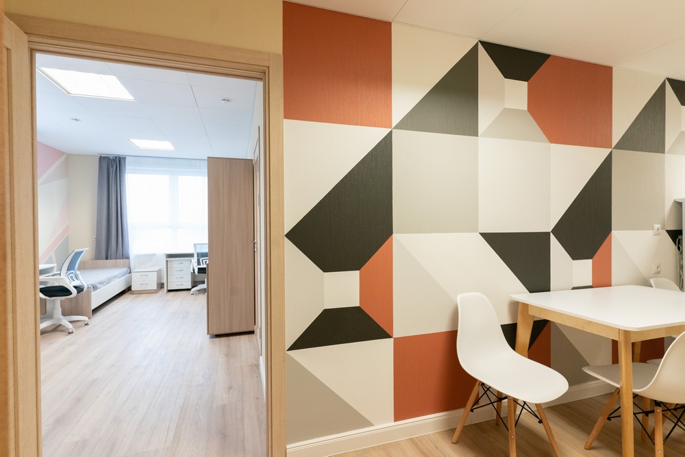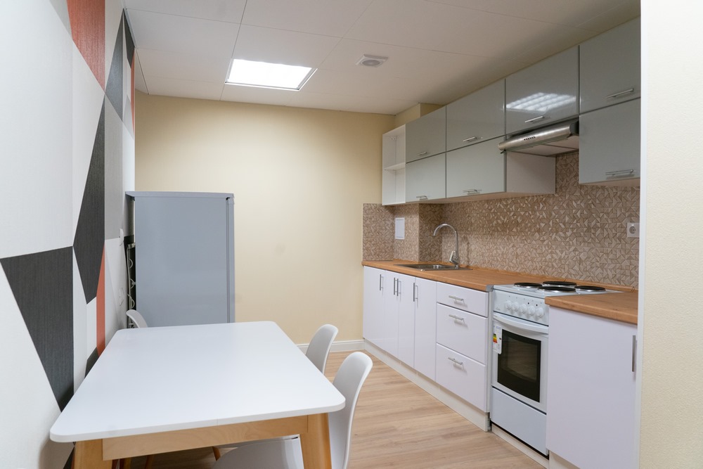 В общежитии кемеровского РГИСИ для проживания студентов оборудованы блоки с кухней, душевыми, санузлами и гардеробными. В блоке по две комнаты на два человека. На каждом этаже есть хозяйственно-бытовые комнаты для стирки, сушки и глажения белья. Предусмотрены помещения для самоподготовки, есть медицинский блок с изолятором и процедурным кабинетом. Для маломобильных жильцов обеспечена доступная среда, на входе в кампус предусмотрен электроподъемник.