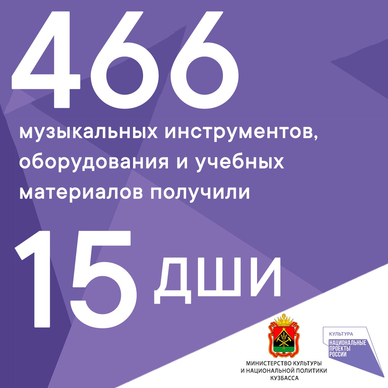 На 100% завершено оснащение детских школ искусств музыкальными инструментами, оборудованием и учебными материалами — в этом году таких учреждений всего 15 в Кемерове, Прокопьевске, Киселевске, Анжеро-Судженске, а также в Прокопьевском, Промышленновском, Топкинском, Тисульском, Яшкинском округах и Таштагольском районе.