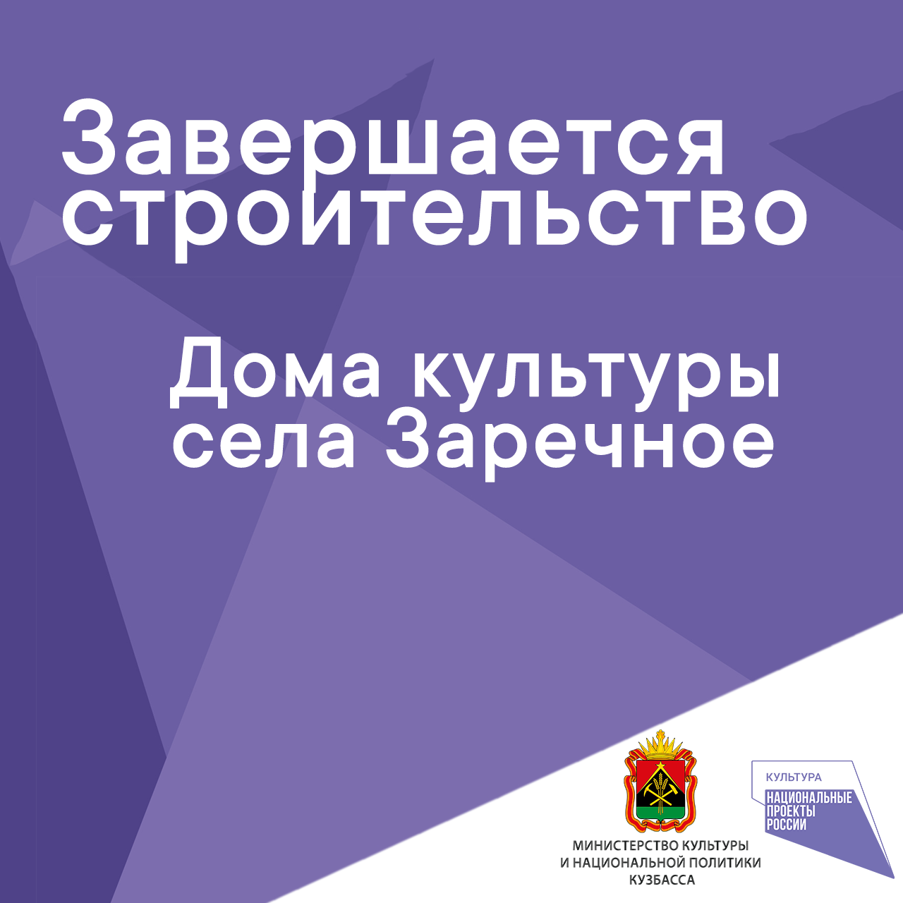 Так, в ближайшее время в Белове состоится открытие сразу четырех объектов - Музейно-выставочного центра, детской школы искусств №76 в поселке Бачатский, оборудованного кинозала в поселке Грамотеино, а также построенного Дома культуры в селе Заречное (место компактного проживания телеутов), в нем предусмотрены студии национальных ремесел и изучения телеутского языка, которые будут способствовать сохранению национальной культуры народности. В Мариинске по нацпроекту началось строительство Центра культурного развития.