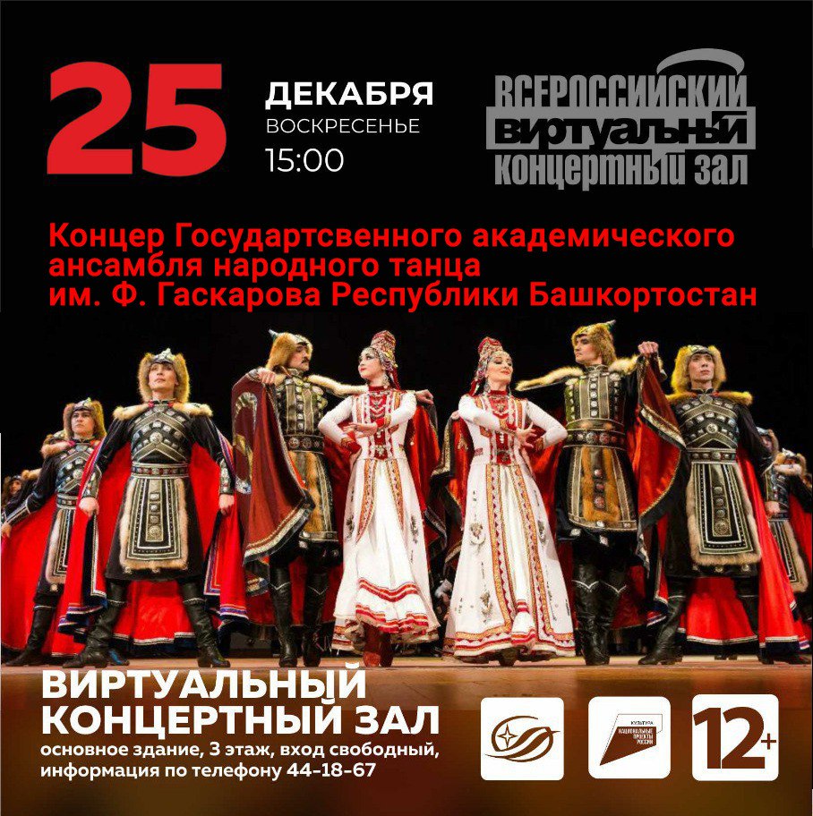 25 декабря в 14:00 в Виртуальном концертном зале, созданном в Государственной научной библиотеке Кузбасса им. В.Д. Федорова в рамках национального проекта «Культура», состоится показ программы, завершающий Год культурного наследия народов России – концерт Государственного академического ансамбля народного танца имени Файзи Гаскарова Республики Башкортостан.