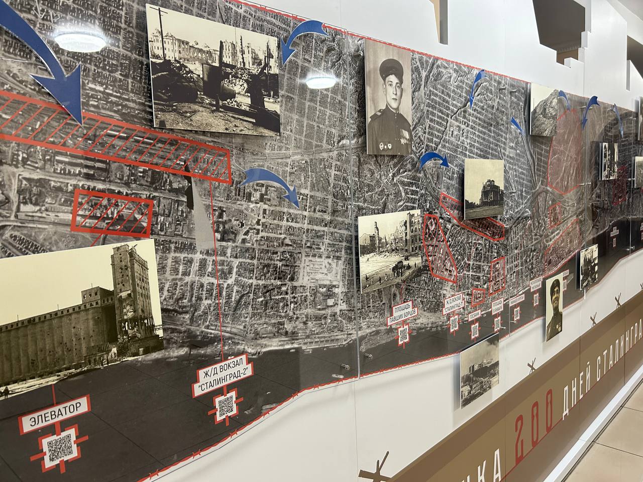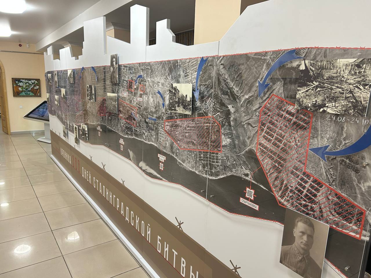 На выставке посетители увидят уникальную карту, увеличенную в десятикратном размере, с изображением Сталинграда в сентябре 1942 года. Длина карты 6 метров, на ней обозначены 13 основных объектов города, которые впоследствии стали символами мужества и славы Сталинграда.