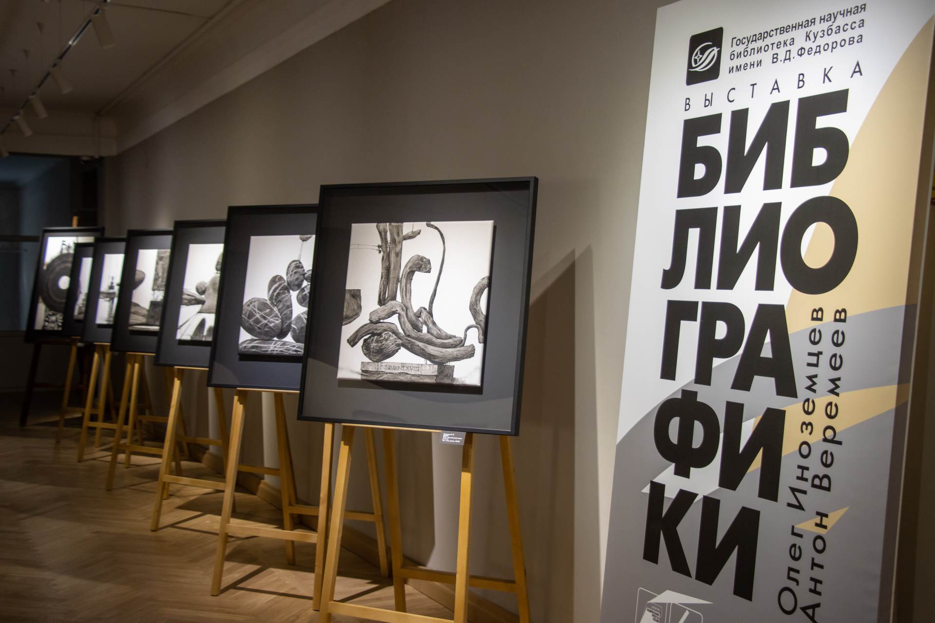 Выставка графических работ кемеровских художников Олега Иноземцева и Антона Веремеева открылась в Государственной научной библиотеке Кузбасса им. В.Д. Федорова.