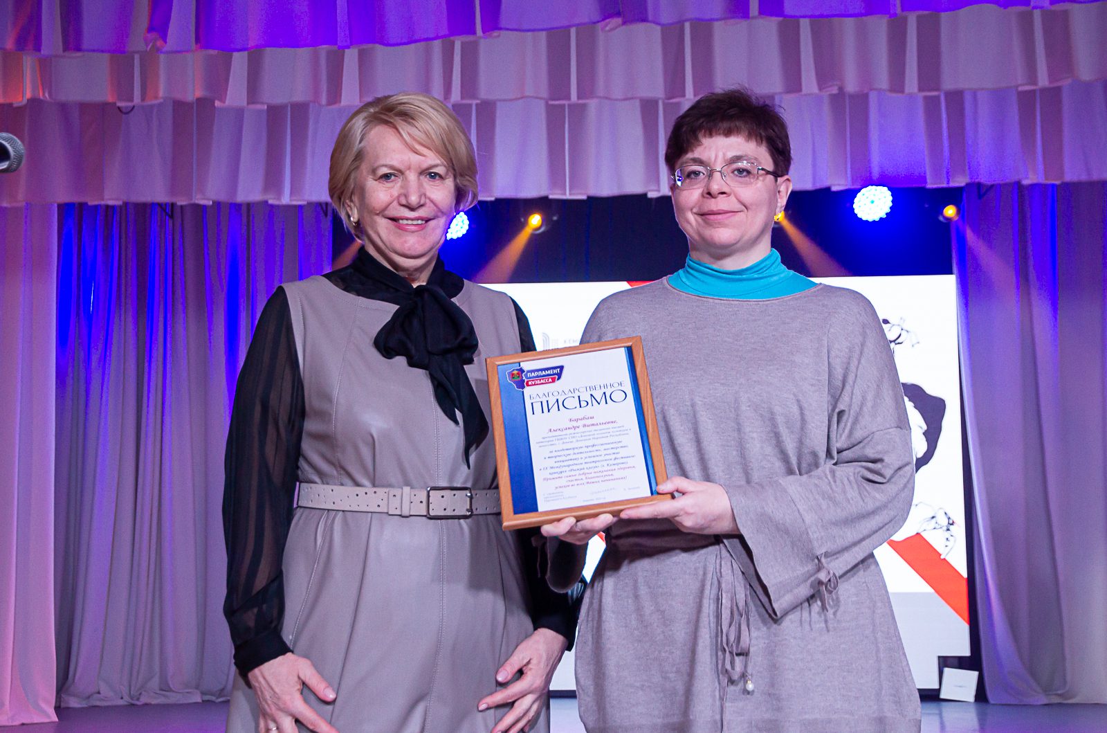 Специальным призом от Парламента Кузбасса награждена преподаватель Донецкого колледжа культуры и искусств Татьяна Шаталова. Награду вручила Ирина Федорова, председатель комитета по вопросам образования, культуры и национальной политики Парламента Кузбасса.
