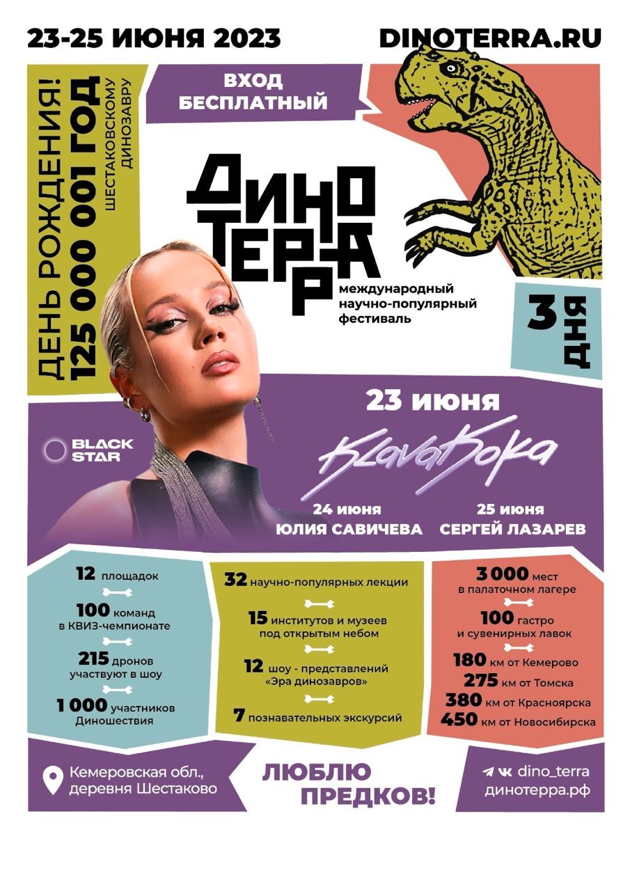 Более 200 ученых, Сергей Лазарев, Клава Кока, Юлия Савичева и 60 000 гостей приедут в Кузбасс отпраздновать День рождения шестаковского динозавра - 125 000 001 год!Утверждены научная и развлекательная части программы фестиваля. Также на сайте динотерра.рф стартовала регистрация гостей.
