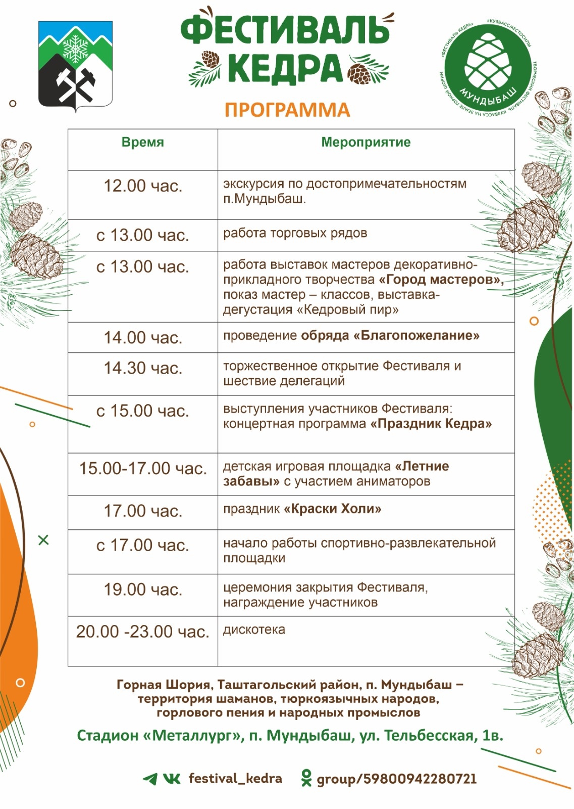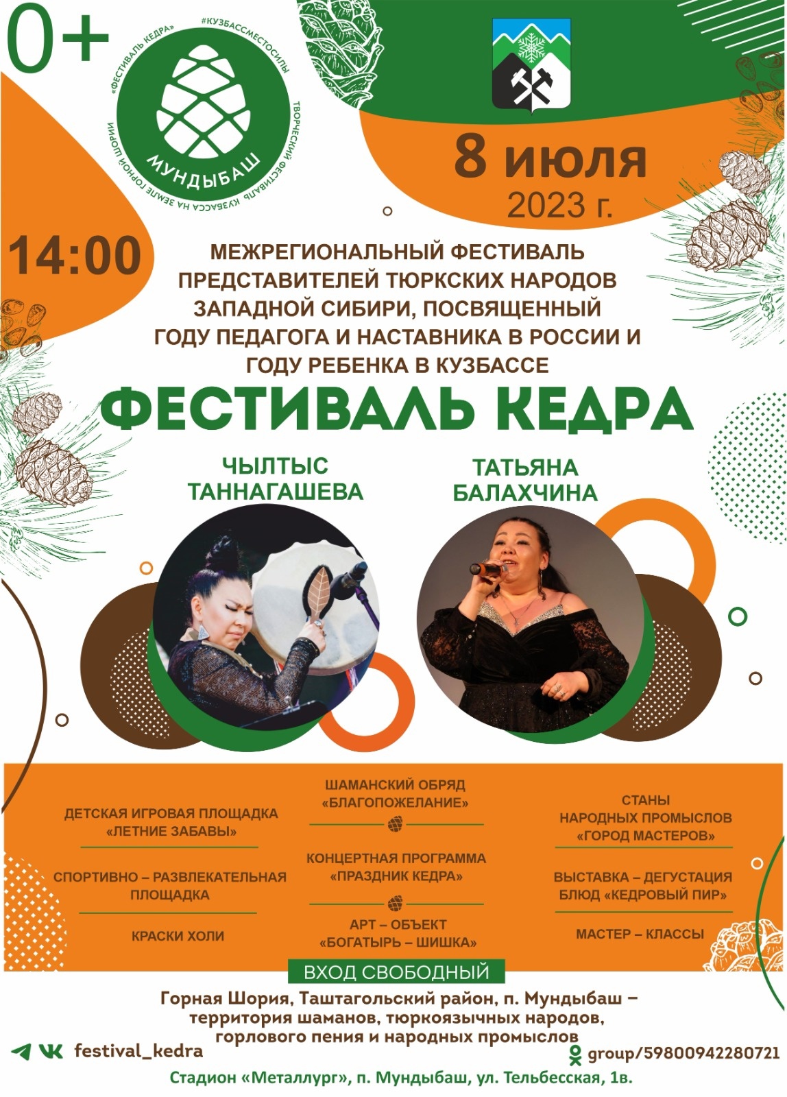 В посёлке Мундыбаш пройдёт Фестиваль Кедра, который состоится 8 июля на стадионе "Металлург".Посетителей ждёт выставка-дегустация «Кедровый пир», проведение обряда «Благопожелание», концертная программа.