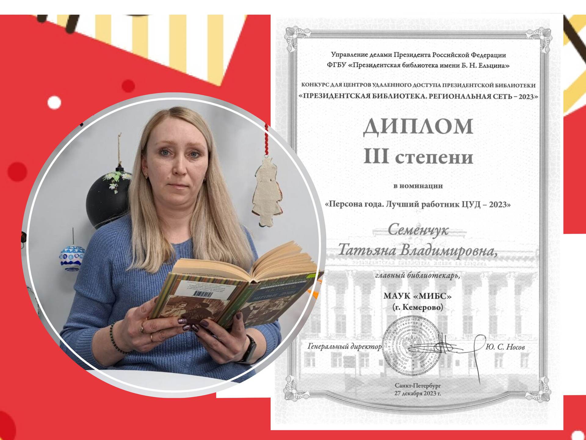 Диплом III степени в номинации «Персона года. Лучший работник ЦУД-2023» - Татьяна Семенчук, главный библиотекарь библиотеки им. Н.В. Гоголя Муниципальной информационно-библиотечной системы г. Кемерово;