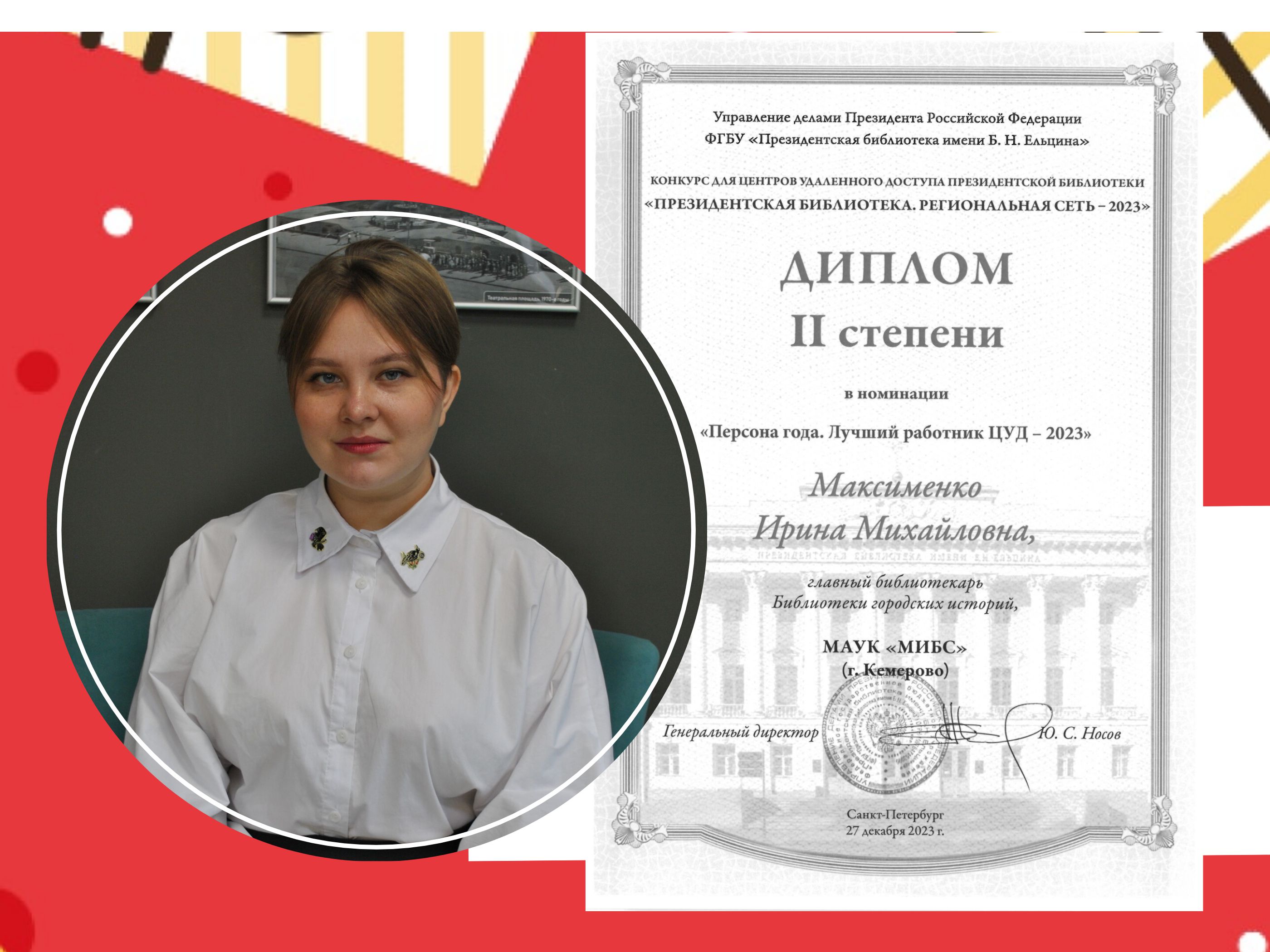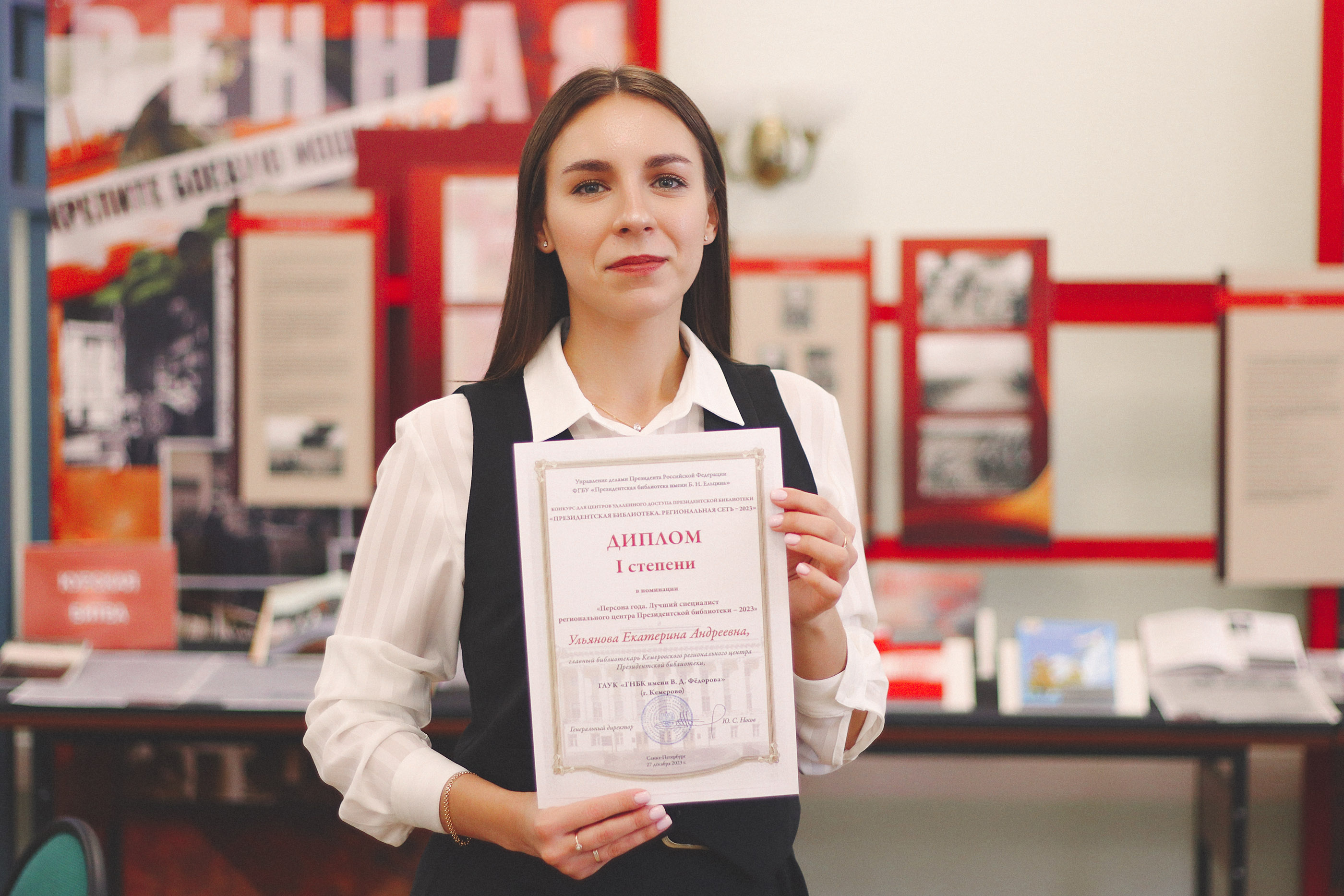 Диплом I степени в номинации «Персона года. Лучший специалист РЦ ПБ-2023» - Екатерина Ульянова, главный библиотекарь Кемеровского регионального центра Президентской библиотеки, работающего на базе Государственной научной библиотеки Кузбасса им. В.Д. Федорова;