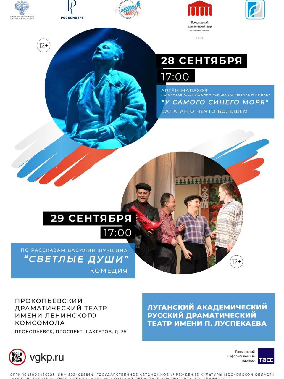 На сцене Прокопьевского Ленкома пройдут гастроли Луганского академического русского драматического театра имени П. ЛуспекаеваПрокопчане и гости города увидят два спектакля: «У самого синего моря» по сказке Александра Пушкина и «Светлые души» по рассказам Василия Шукшина. В постановках артисты труппы Луганского театра расскажут о золотой рыбке, глубинах миросозидания и мудрых чудаках.