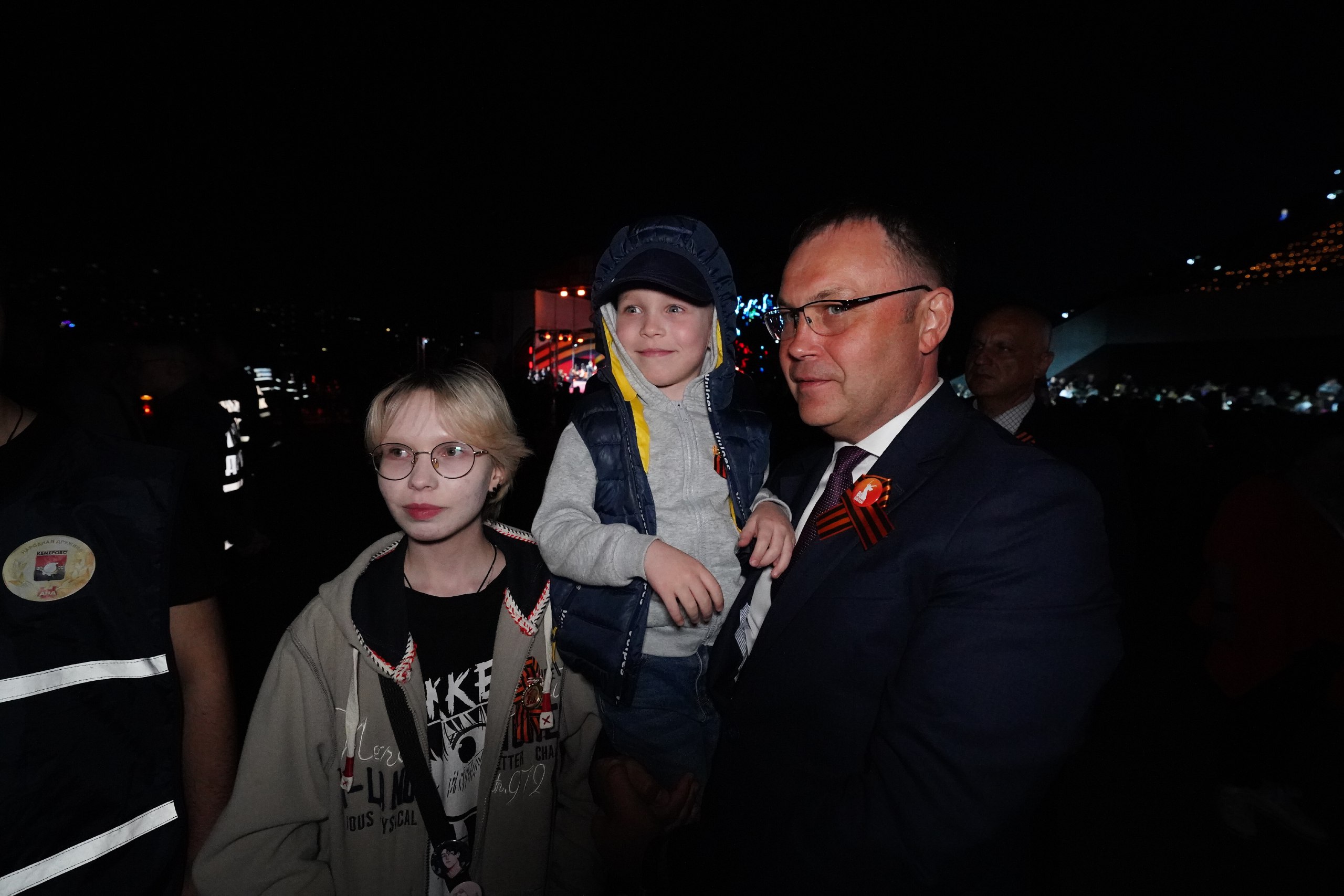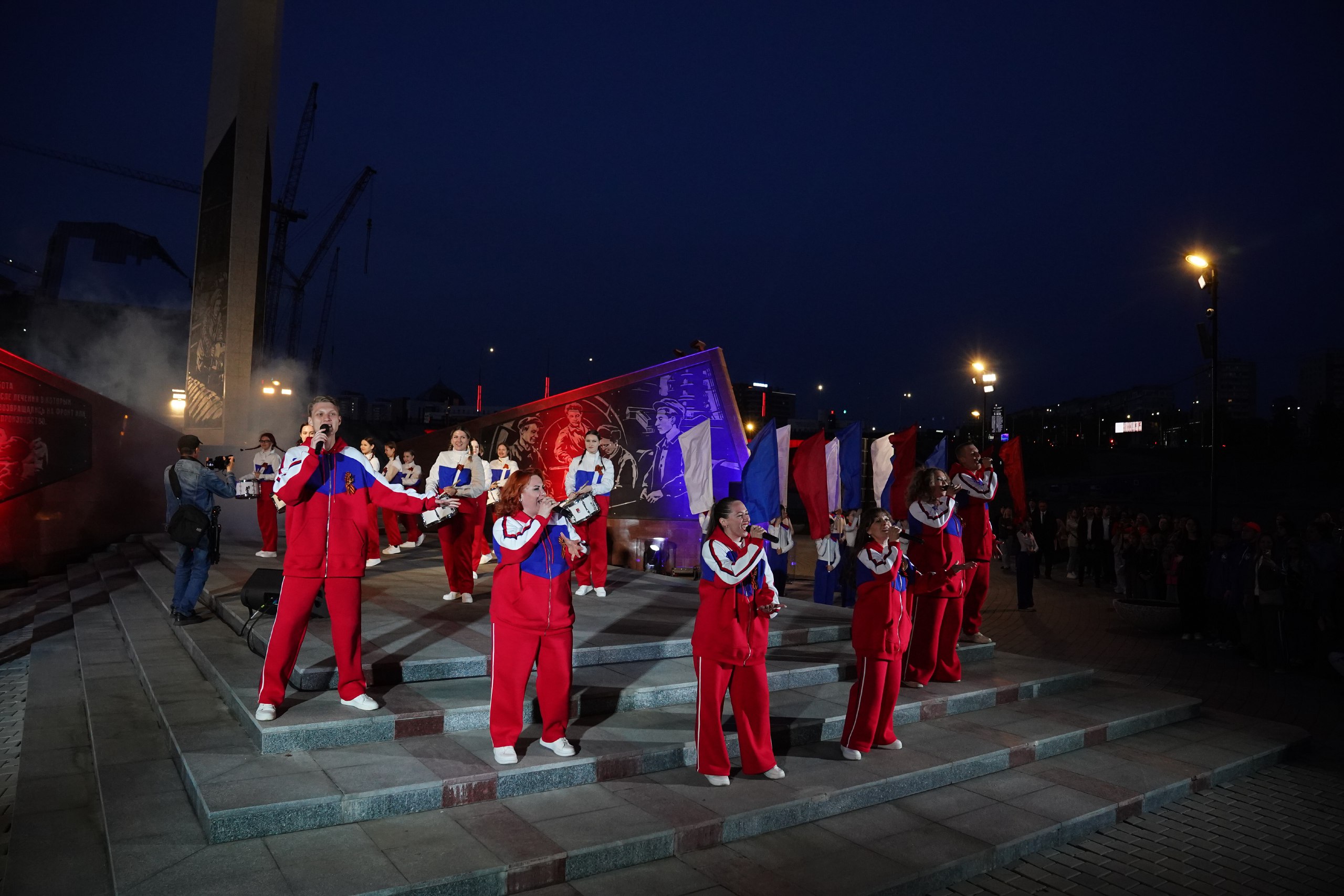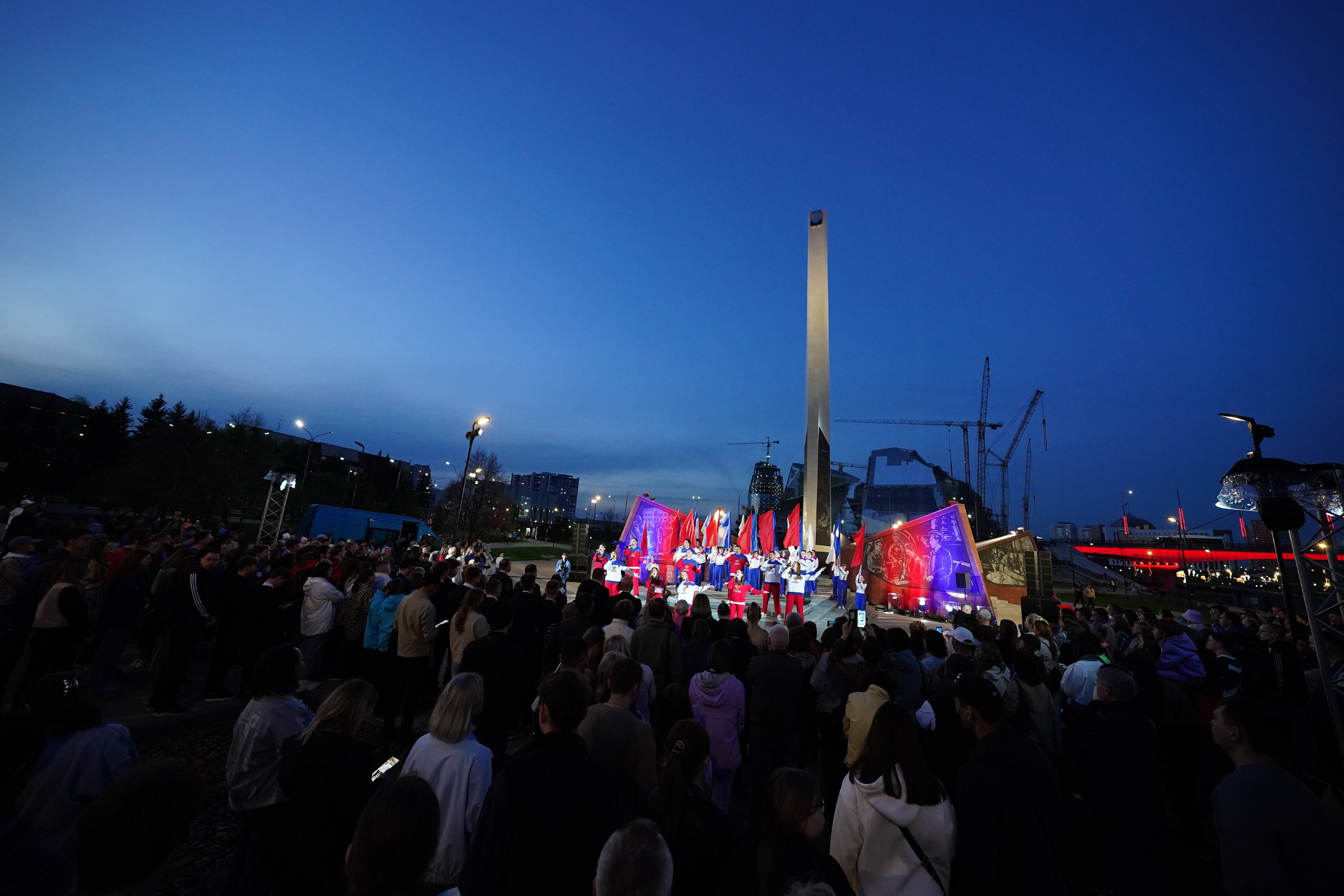 В парке Победы им. Г.К. Жукова в Кемерове в рамках акции «Лучи Победы» прожекторы осветили стелу «Город трудовой доблести». На праздничном концерте выступили творческие коллективы города.