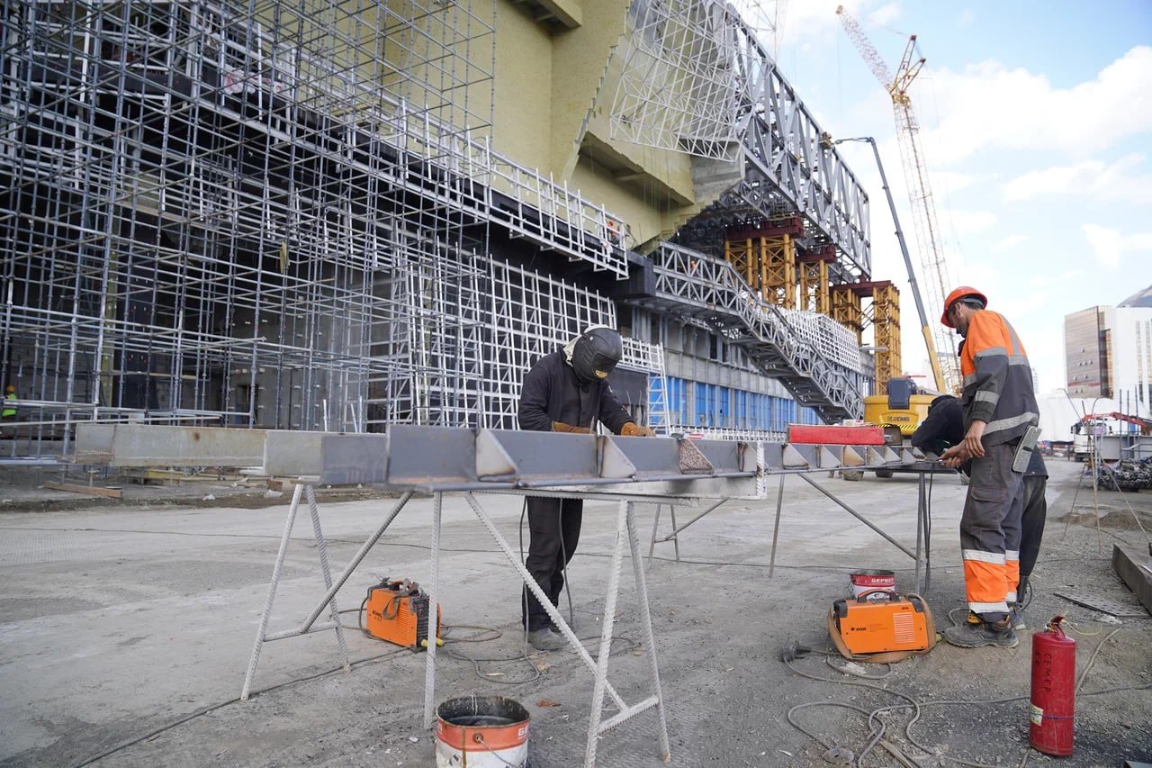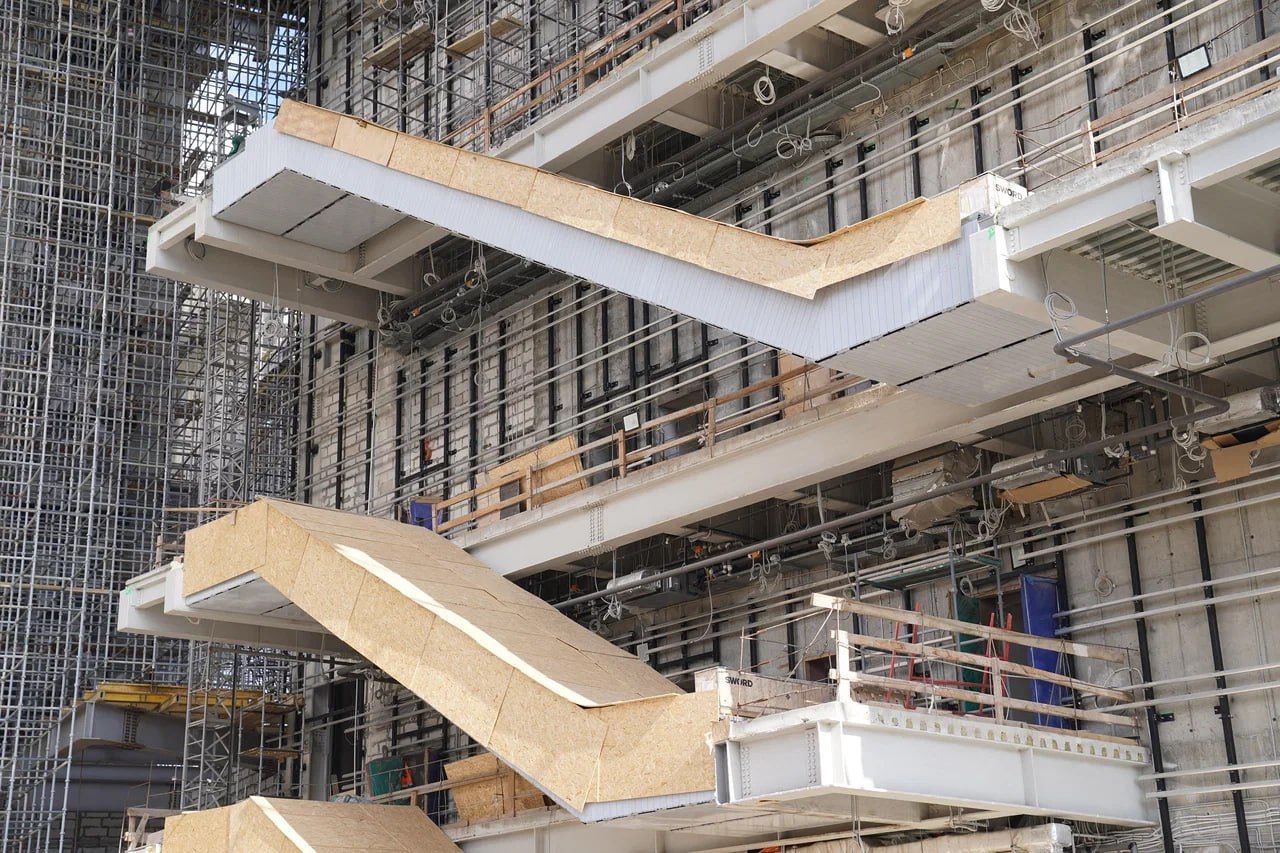 В единый комплекс три культурных учреждения объединит атриум. Здесь начался монтаж входной группы: металлоконструкции монументального входа проходят укрупнительную сборку перед установкой, ведется монтаж металлокаркаса и бетонирование ресторанной зоны.