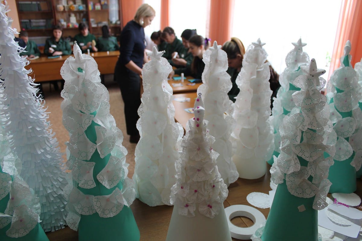 В преддверии новогодних праздников педагоги колледжа показали, как своими руками сделать открытки и бумажные елки, празднично оформить окна.