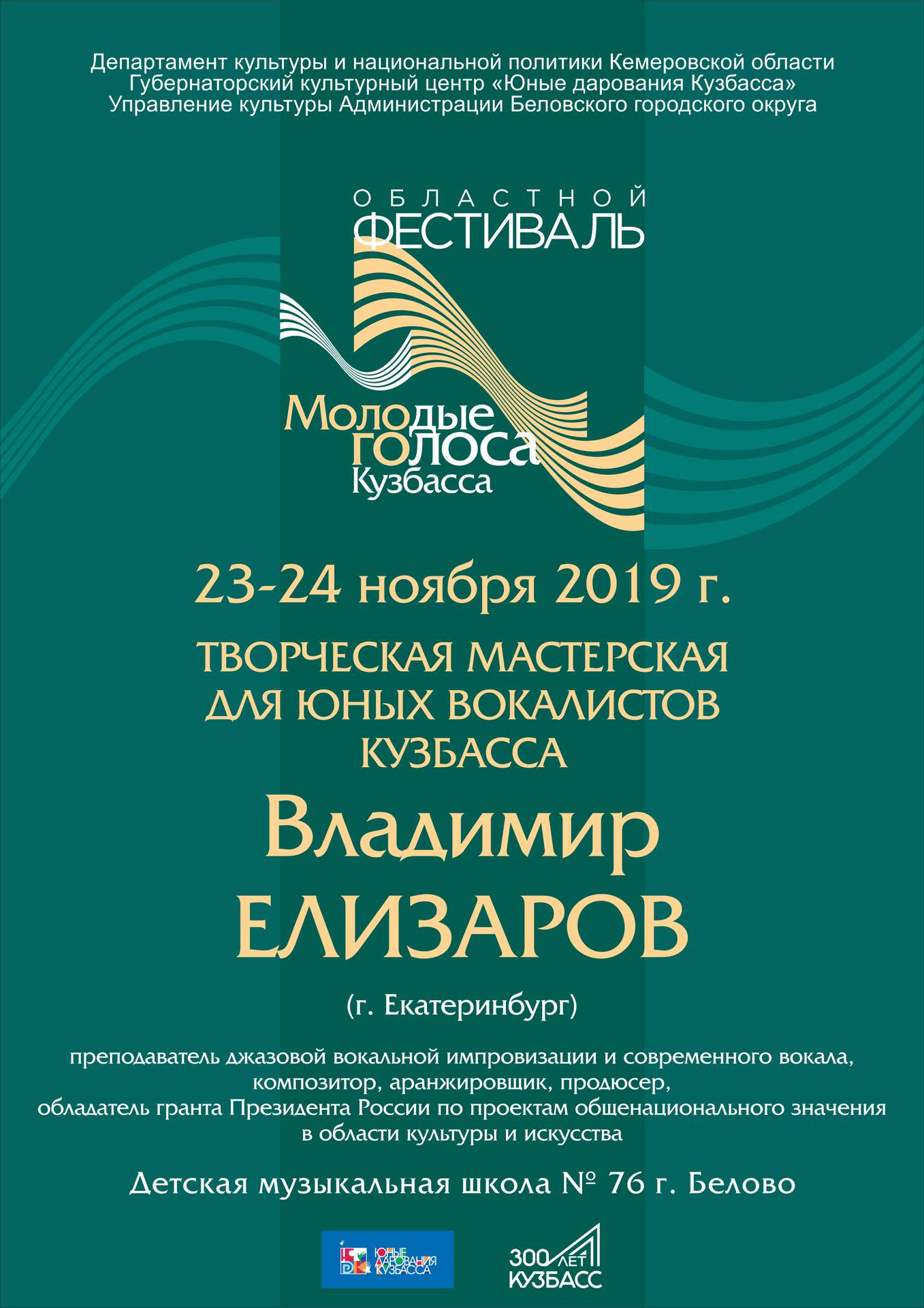 В рамках областного фестиваля «Молодые голоса Кузбасса» 23 и 24 ноября в детской музыкальной школе № 76 пройдет творческая мастерская для юных вокалистов Кузбасса Владимира Елизарова.