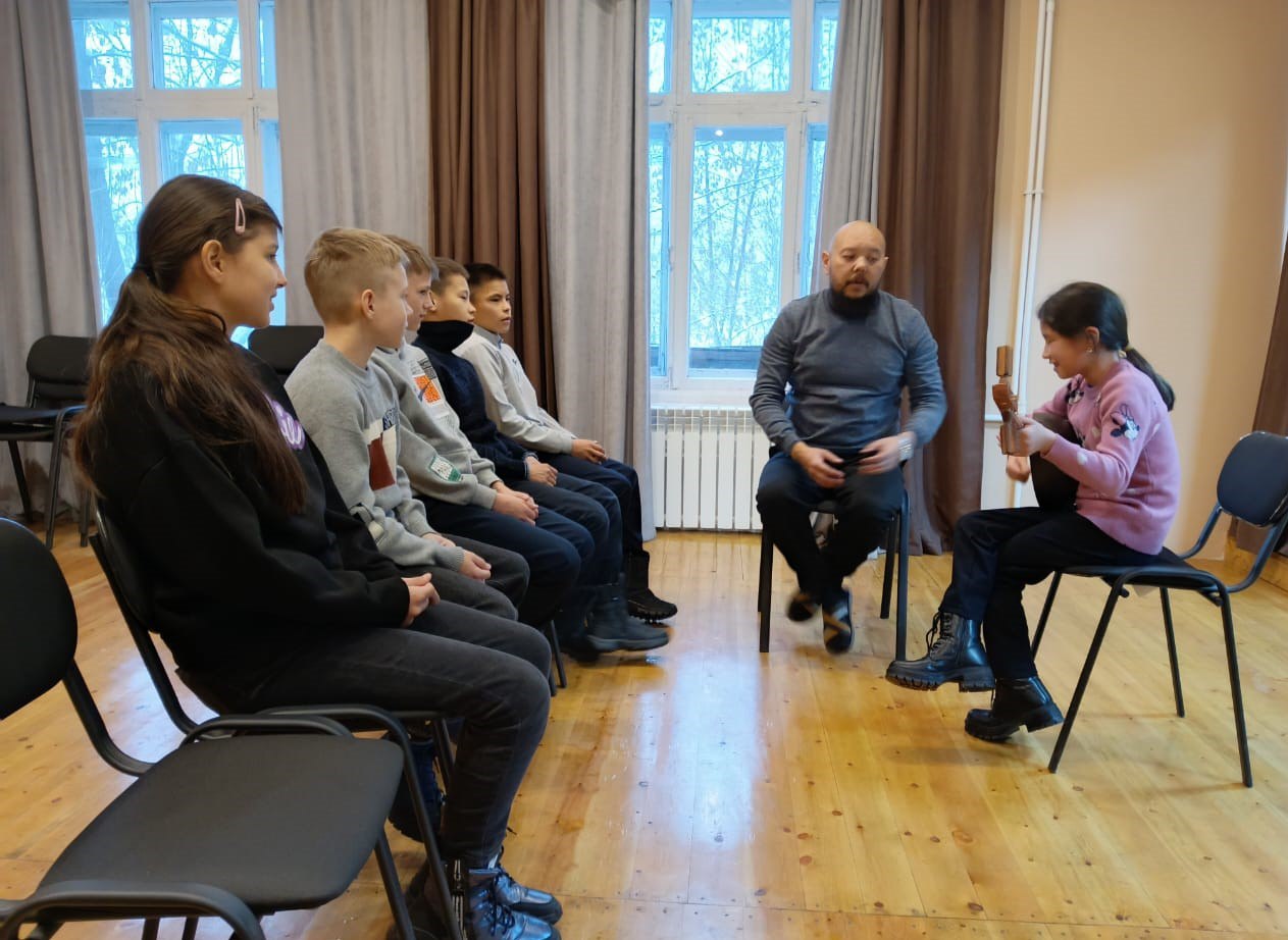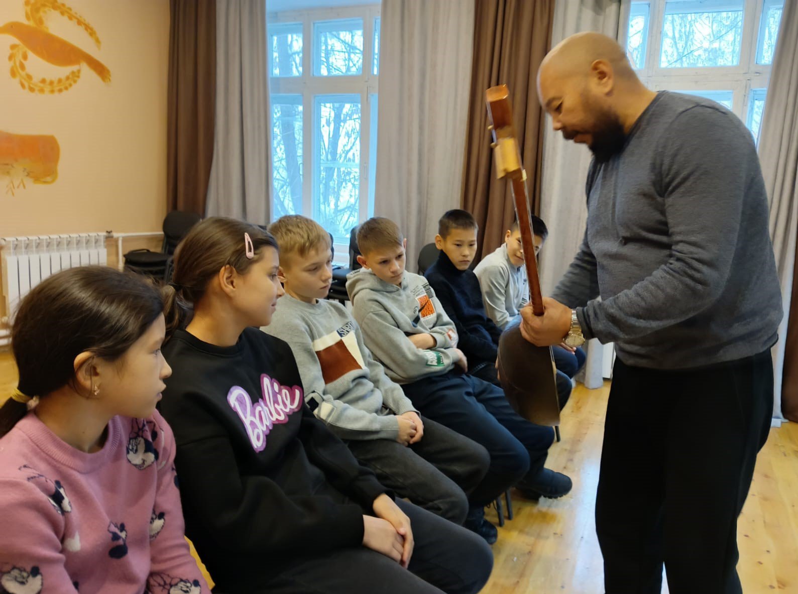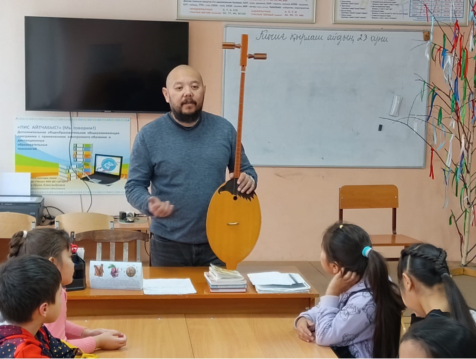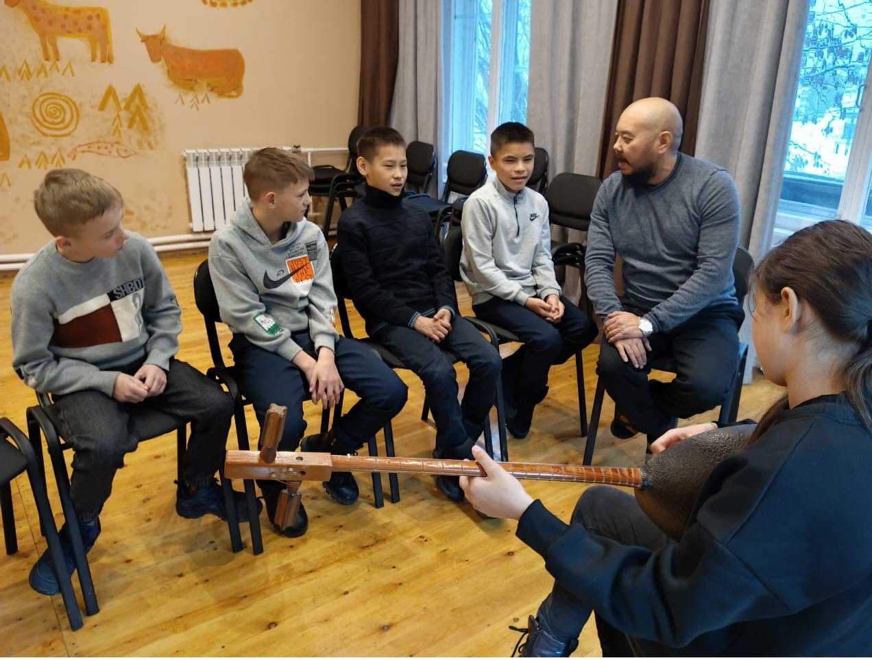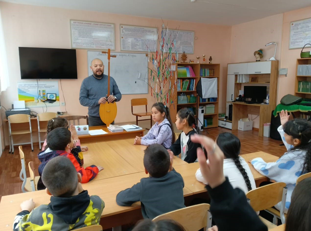 Преподаватель Хакасского колледжа искусств по специальности «Национальные инструменты народов России» (хомыс, чатхан, ыых) Вячеслав Албычаков провел мастер-класс с музыкальным инструментом Кая-комусом и продемонстрировал извлечение звуков Кая.
