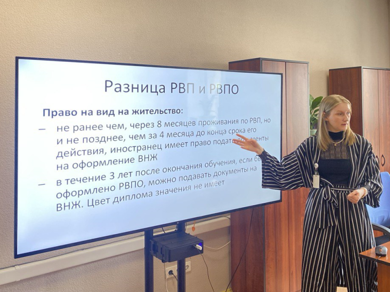 В ходе мероприятия сотрудники ответили на вопросы студентов, касающиеся получения разрешения на временное проживание в России, различия между РВП и РВПО, необходимости оформления ВНЖ, процедуры подачи заявления и документов на РВП, тестов по русскому языку для получения сертификата, которые требуются для оформления ВНЖ, а также документов, необходимых для составления трудового договора.